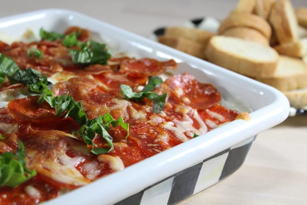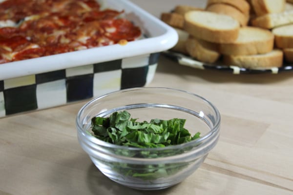 Spread ricotta into an even layer on the bottom of the baking dish. Sprinkle parsley over the ricotta, then spread a thin layer of marinara over the herbs. Top with single layers each of Parmesan, pepperoncini, black olives, mozzarella and pepperoni. Broil until the cheese has melted.