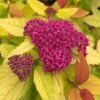 New colorful Spiraea introduction with purple flowers and foliage that changes from red to yellow and then finally orage and it matures. This is the perfect accent plant to bring a pop of color to your garden!